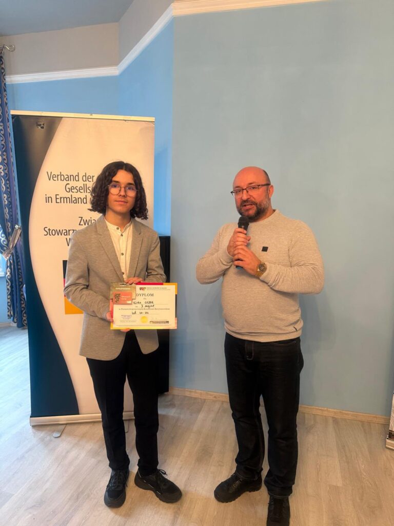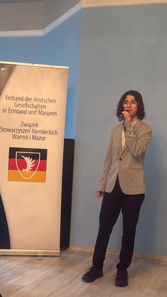 Kolejny wyjazd do Olsztyna. Tym razem na wojewódzki Niemieckojęzyczny Konkurs Recytatorski, który odbył się w Stowarzyszeniu Mniejszości Niemieckiej. Uczeń naszej szkoły Igor Łazar zajął dumnie II miejsce w kategorii kl.7-8. Zaprezentował wiersz „Knecht Ruprecht” Theodora Sturma, który przygotował pod okiem nauczycielki języka niemieckiego. Jury, jak i uczestnicy stwierdzili, że tekst był dość trudny, ale Pani Klaudia widziała potencjał w naszym zdolnym uczniu i nie myliła się. Igor świetnie poradził sobie z interpretacją i wymową. Nie obyło się również bez wywiadów do Allensteiner Welle.